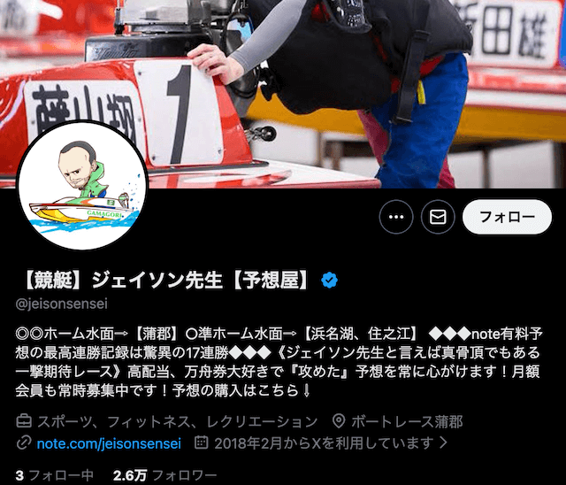ジェイソン先生は、X(旧Twitter)上でデータ重視の競艇予想を発信している分析型アカウントとして知られている。