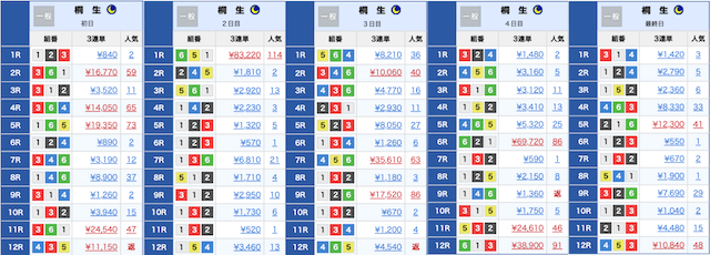 これが多いのか少ないのかが分からない人も居ると思うので、桐生のモーター交換前の5日間開催の結果を見てみた。