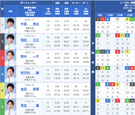 そのため、スタート次第では、平均STが速い2・3号艇に差しやまくりを決められる可能性は大いにありそうです。