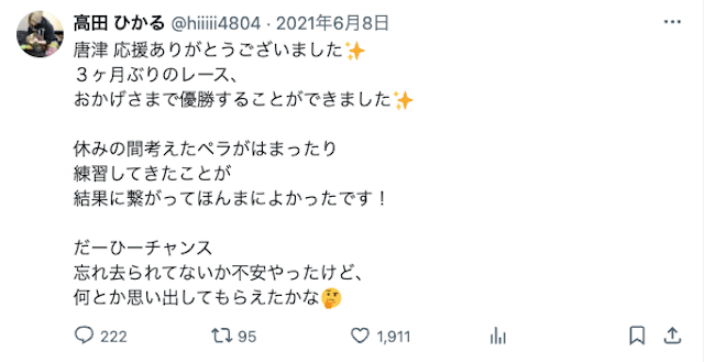 本名で活動せずに別のアカウント名で発信をしている可能性もあるため、あくまで競艇選手「高田ひかる」としての活動が不明という状況です。