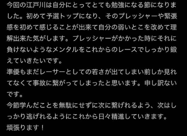 レース終わりの心境やファンに対するコメントなどを残していました。