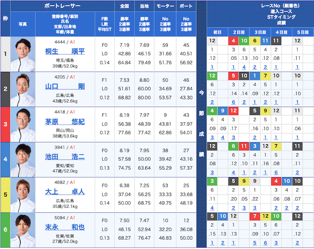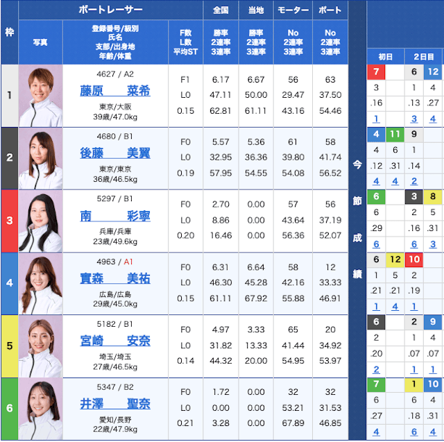| 枠 | レーサー | 全国 | 当地 | モーター | ボート | |