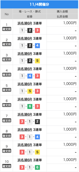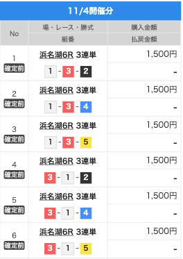 2025/11/04 浜名湖6R【️️️️️️ 3連単 46.2倍 46,200円