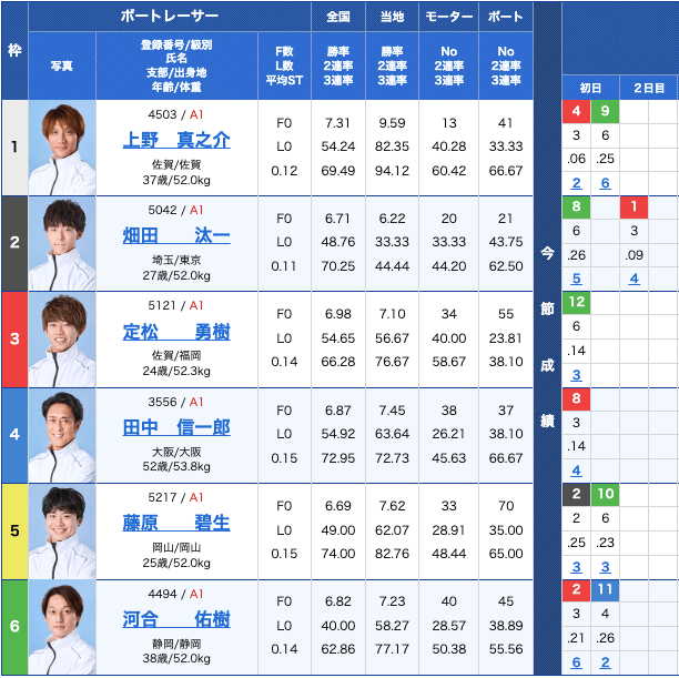 初日は鋭いスタートを見せた①上野、2走目こそ6コースから6着だったがこれに関してはやむなしなので、度外視可能。