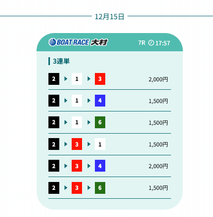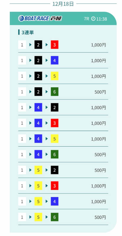 | 2025/12/18 | 芦屋7R【️️️️️️】 | 3連単 | 15.7倍 | 15,700円 |