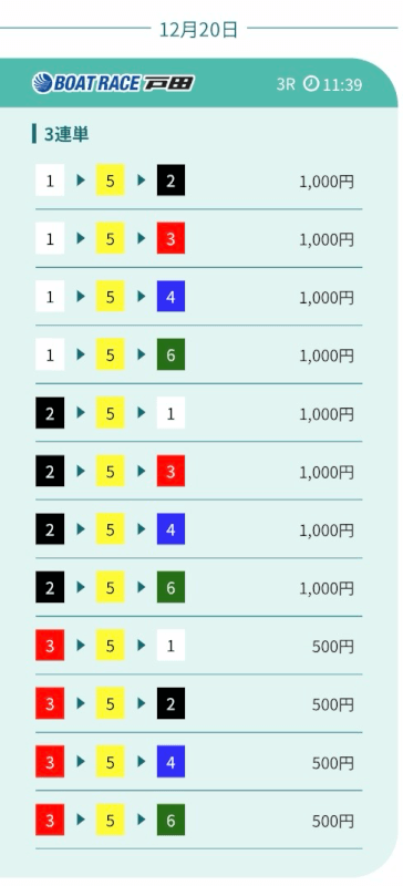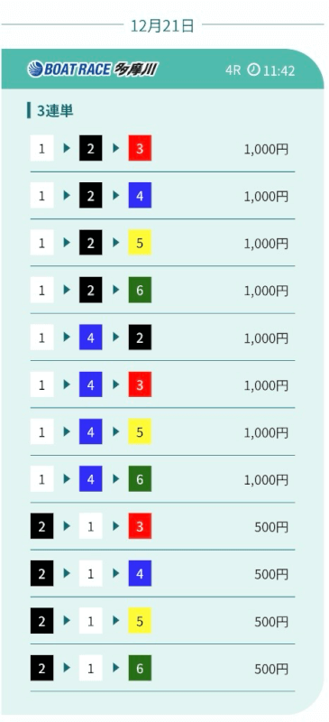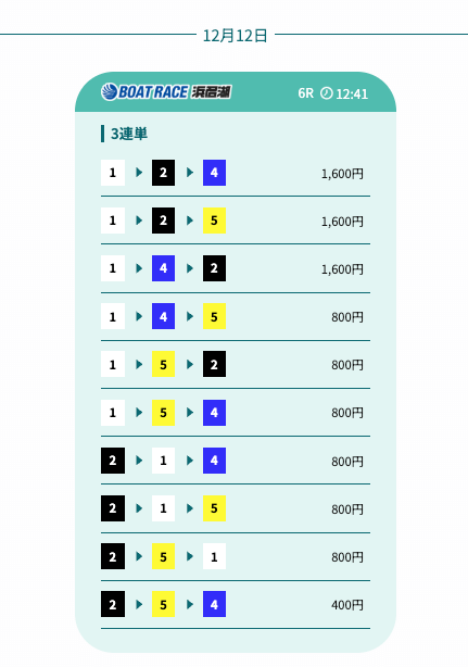 | 2025/12/12 | 浜名湖6R【️️️️️️】 | 3連単 | 14.4倍 | 21,600円 |