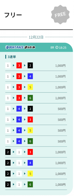 | 2025/12/22 | 丸亀8R【️️️️️️】 | 3連単 | 14.2倍 | 14,200円 |