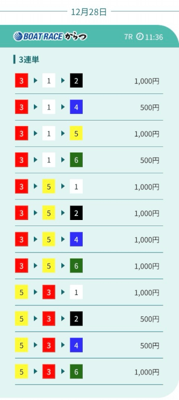 | 2025/12/28 | 唐津7R【️️️️️️】 | 3連単 | 19.8倍 | 19,800円 |