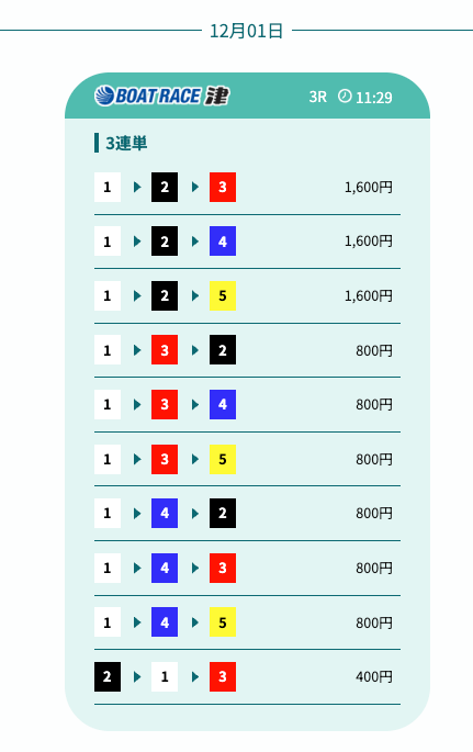 | 2025/12/01 | 津3R【️️️️️️】 | 3連単 | 30.6倍 | 48,960円 |