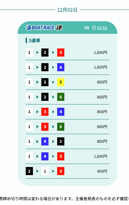 | 2025/12/02 | 津6R【️️️️️️】 | 3連単 | 22.8倍 | 36,480円 |