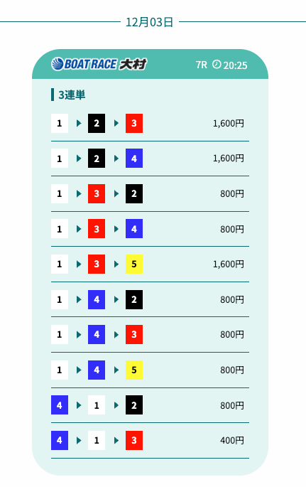 | 2025/12/03 | 大村7R【️️️️️️】 | 3連単 | 21.0倍 | 33,600円 |