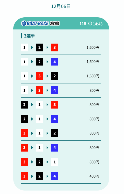 | 2025/12/06 | 宮島11R【️️️️️️】 | 3連単 | 9.8倍 | 15,680円 |