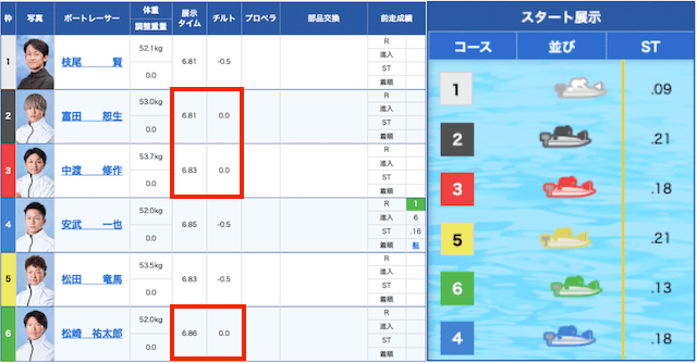 相手には、チルトを0度にしている⑤⑥号艇を選んでみた。