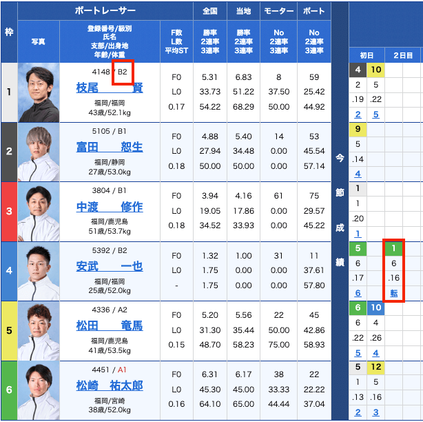 そこで、出走表を見てみると、②・⑥号艇にA級選手が配置されていることがわかる。