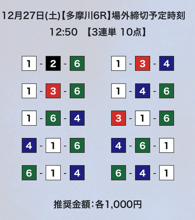 無料予想を含めて、ここまでの参加結果から見解予想は必要ないと思うので、買い目と購入金額からご覧いただこう。