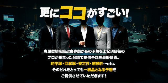競艇会議は専属契約を結ぶ舟券師が複数人おり、その人物達から情報を仕入れた上で提供する予想を最終精査しているとのこと。