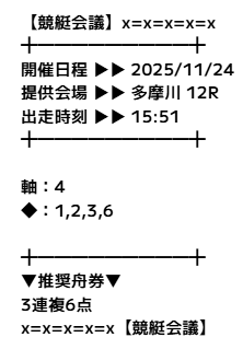 軸候補はA級の3人、静水面の多摩川ならインを信用したいところだが、B級選手のスタートが遅れた場合は3コースからツケマイやまくり差しを警戒しておきたいところ。