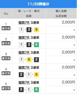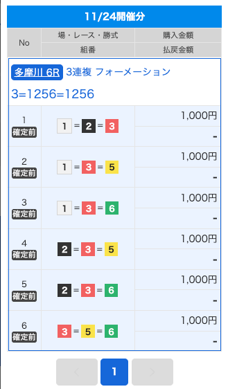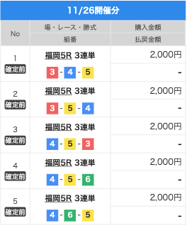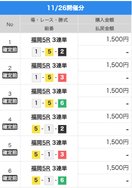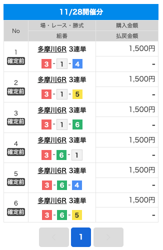 無料予想を含めて、ここまでの参加結果から見解予想は必要ないと思うので、買い目と購入金額からご覧いただこう。