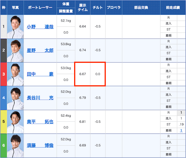 直前情報で気になったのは③田中の展示タイムとチルト角度。