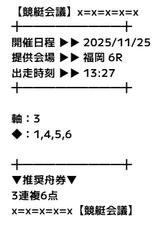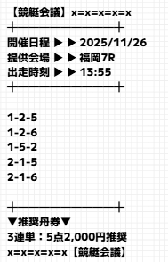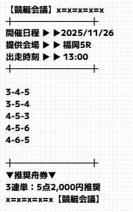 早速、2レース提供の1レース目で提供された2025年11月26日福岡5Rの出走表を見ていく。