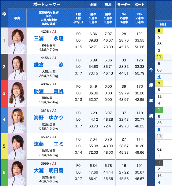 三浦は初日を5コースから3着に入線しており、行き足もそこそこで好枠なら逃げが期待できる。