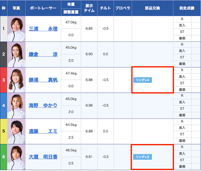 直前情報で気になったのは③勝浦と⑥大瀧の部品交換。