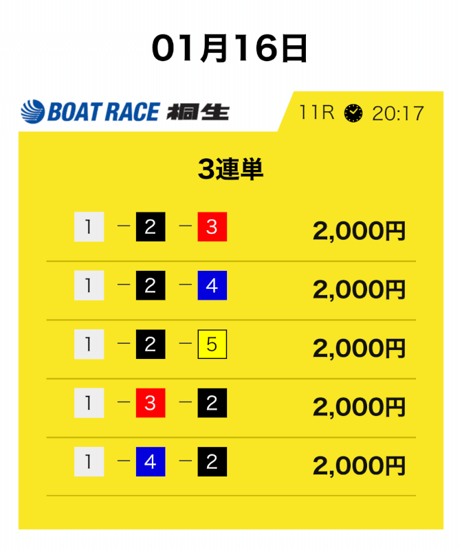 | 2025/11/16 | 桐生12R【️️️️️️】 | 3連単 | 20.1倍 | 40,200円 |