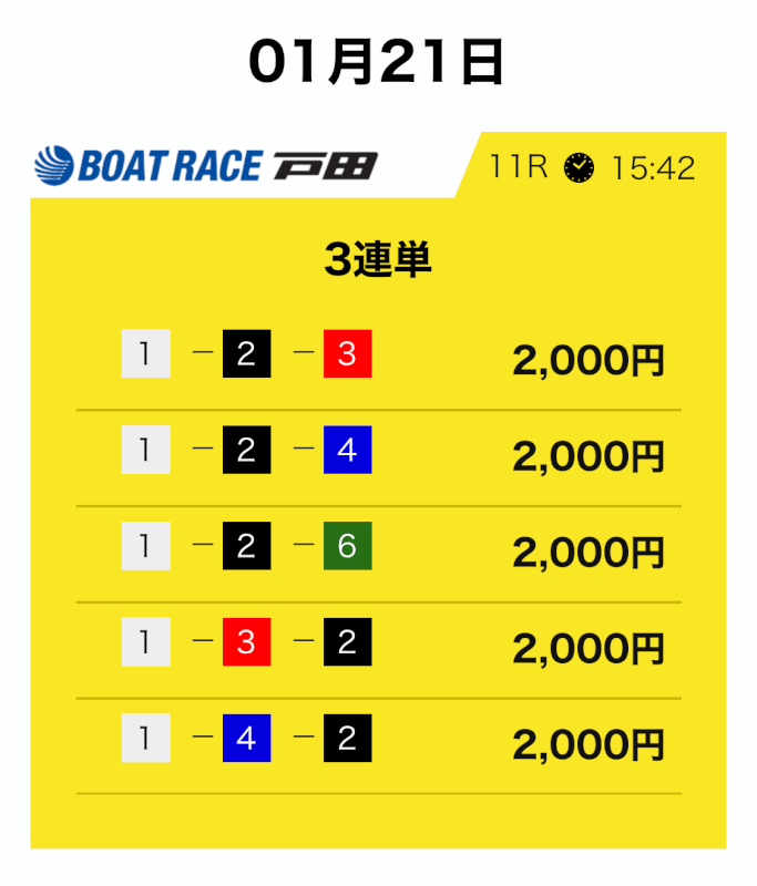 | 2026/01/21 | 戸田11R【️️️️️️】 | 3連単 | 7.9倍 | 15,800円 |
