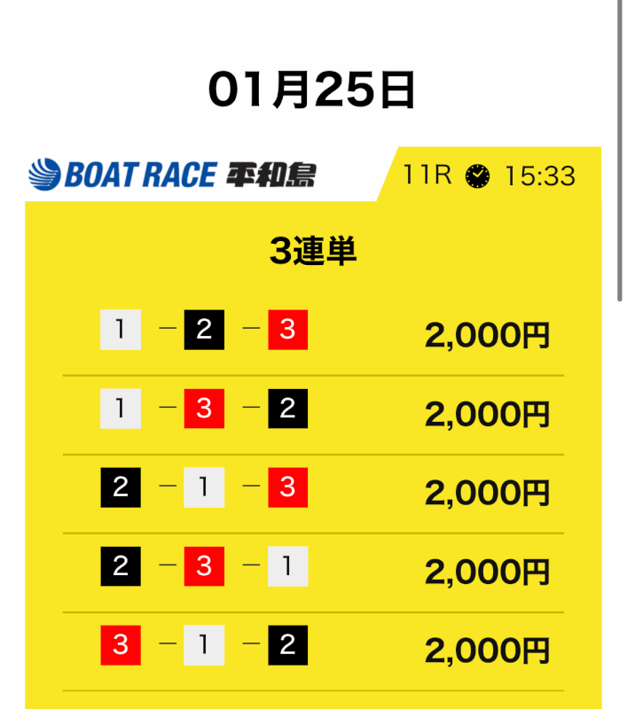 | 2026/01/25 | 平和島11R【️️️️️️】 | 3連単 | 11.6倍 | 0円 |
