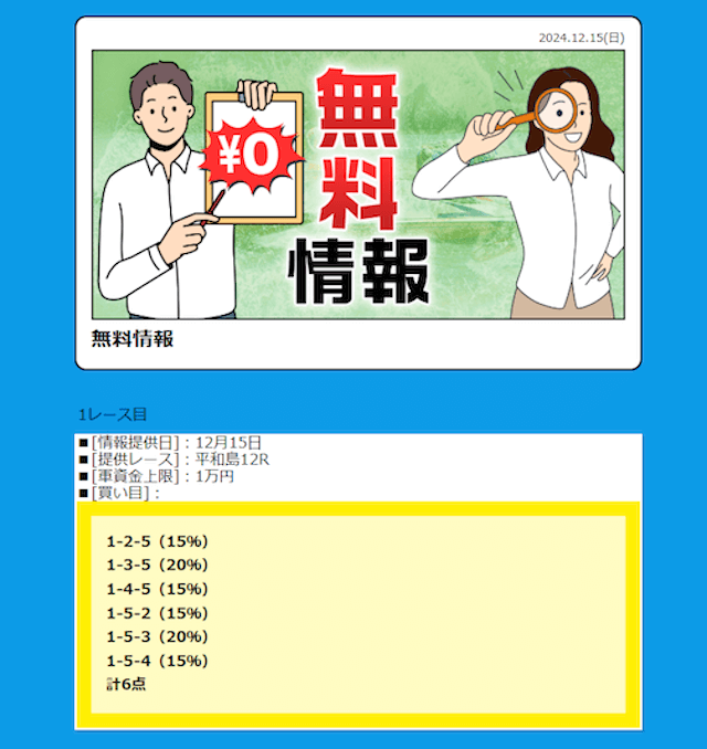 | 2024/12/15 | 平和島12R【️️️️️️】 | 3連単 | 13.3倍 | 26,600円 |