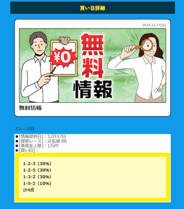 | 2024/12/17 | 浜名湖8R【️️️️️️】 | 3連単 | 8.8倍 | 26,400円 |