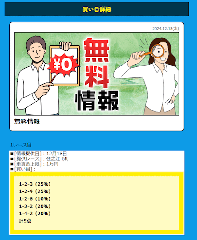 | 2024/12/18 | 住之江6R【️️️️️️】 | 3連単 | 10.1倍 | 25,250円 |