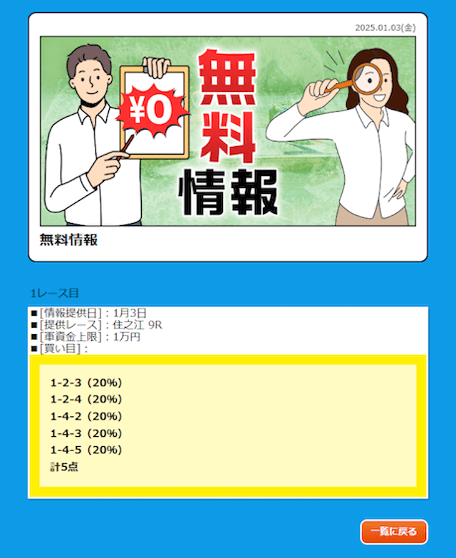 | 2025/01/03 | 住之江9R【️️️️️️】 | 3連単 | 7.5倍 | 15,000円 |