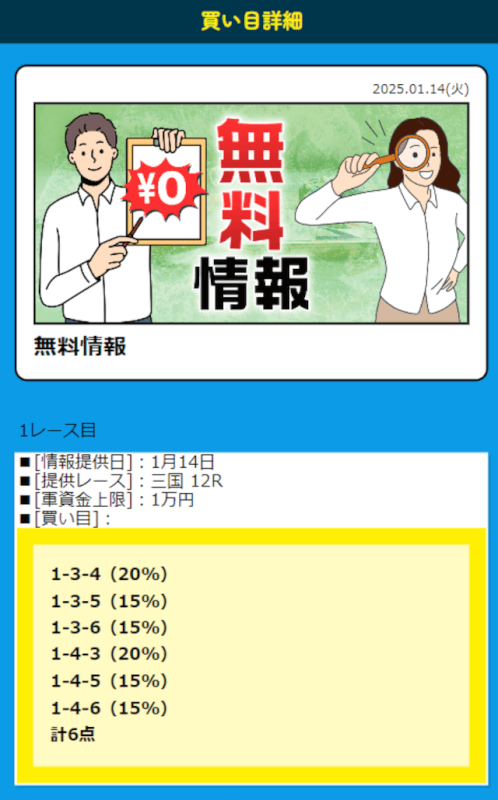 | 2025/01/14 | 三国12R【️️️️️️】 | 3連単 | 32.4倍 | 48,600円 |