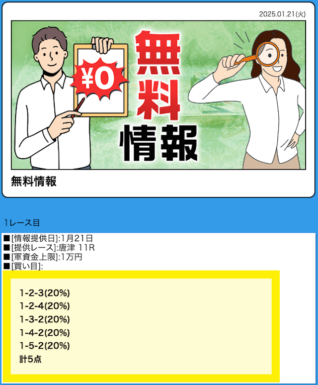 | 2025/01/21 | 唐津11R【️️️️️️】 | 3連単 | 120.9倍 | 0円 |