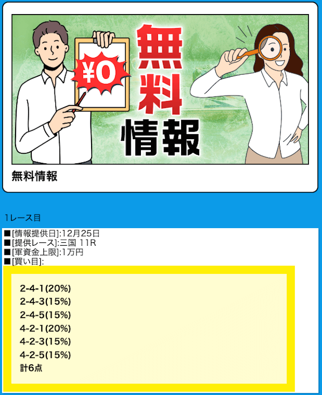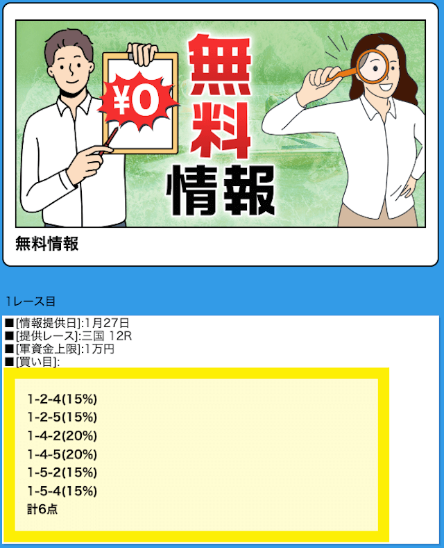 | 2025/01/27 | 三国12R【️️️️️️】 | 3連単 | 14.8倍 | 29,600円 |