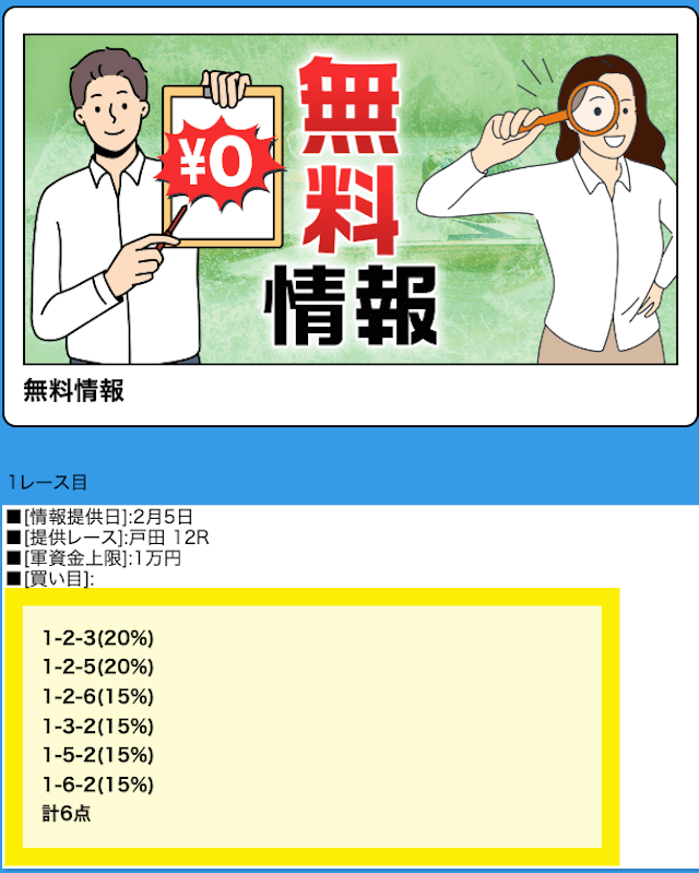 | 2025/02/05 | 戸田12R【️️️️️️】 | 3連単 | 11.4倍 | 22,800円 |