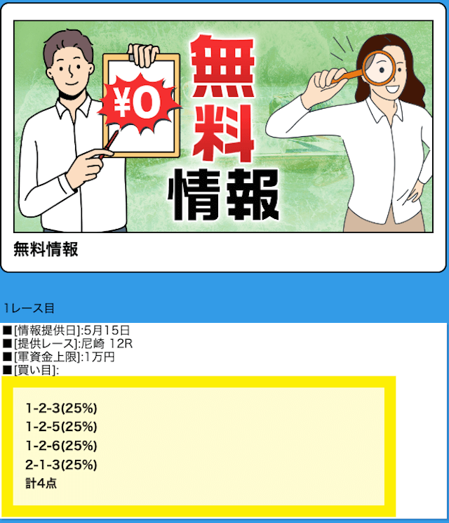 | 2025/05/15 | 尼崎12R【️️️️️️】 | 3連単 | 20.0倍 | 50,000円 |