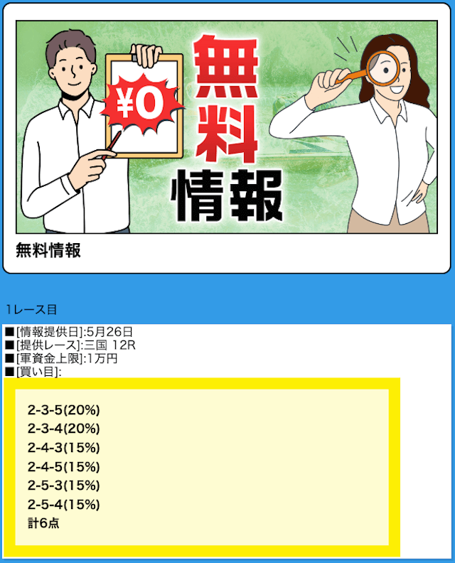 | 2025/05/26 | 三国12R【️️️️️️】 | 3連単 | 20.8倍 | 41,600円 |