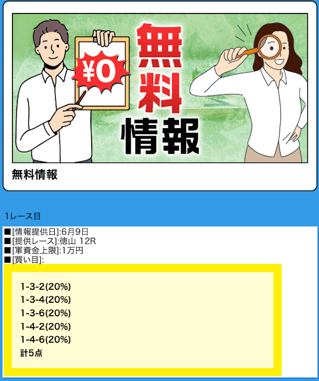 | 2025/06/09 | 徳山12R【️️️️️️】 | 3連単 | 9.1倍 | 18,200円 |