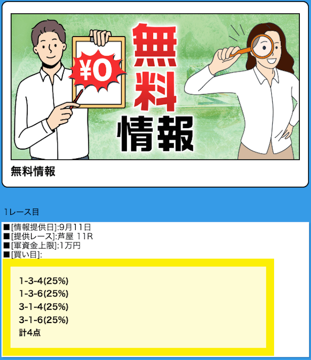 | 2025/09/26 | 芦屋12R【️️️️️️】 | 3連単 | 10.1倍 | 20,200円 |