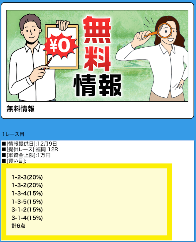 | 2025/12/09 | 福岡12R【️️️️️️】 | 3連単 | 13.1倍 | 26,200円 |