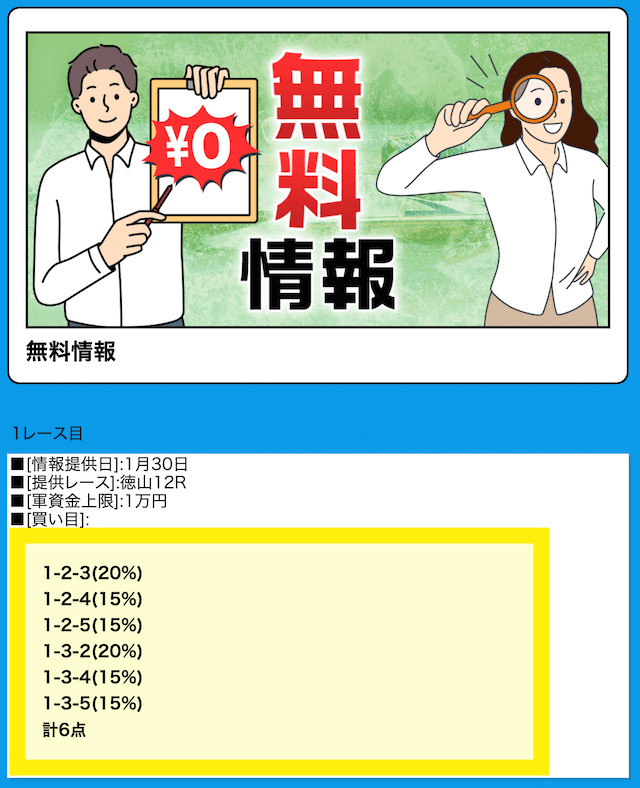 | 2026/01/20 | 徳山12R【️️️️️️】 | 3連単 | 6.1倍 | 12,200円 |