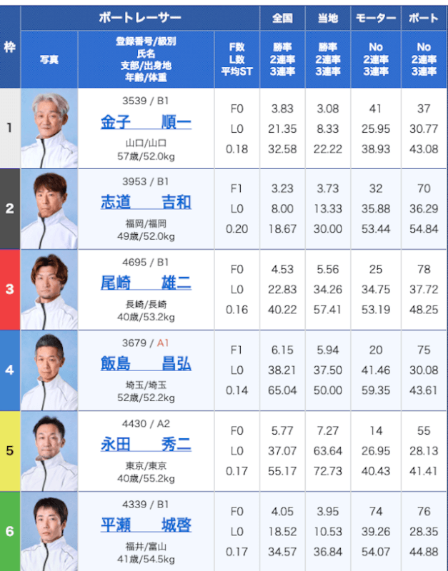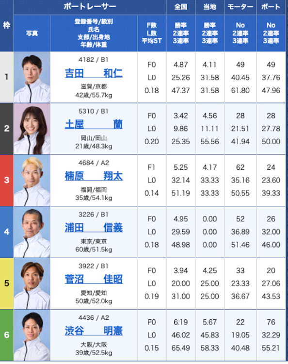 ③梅原はF持ちであるものの、⑥渋谷は全国勝率が「6.19」と最も高い。