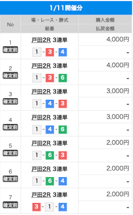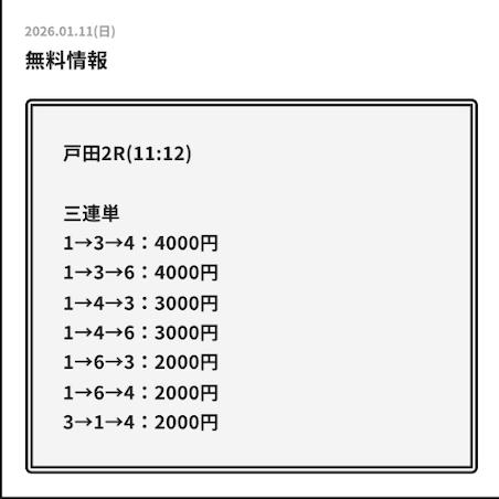| 2026/01/11 | 戸田2R【️️️️️️】 | 3連単 | 12.8倍 | 51,200円 |