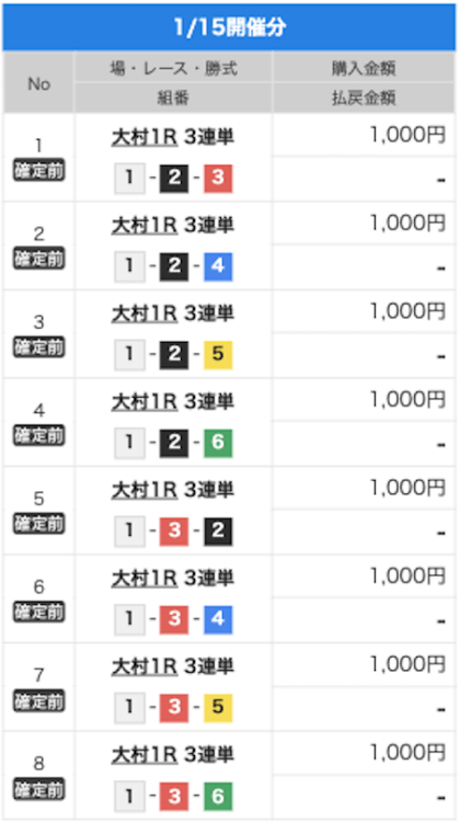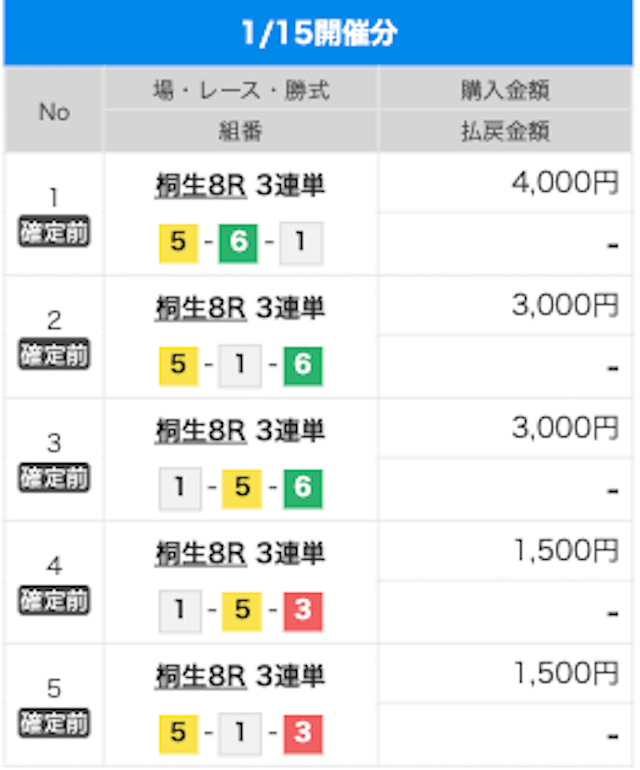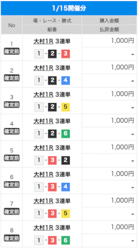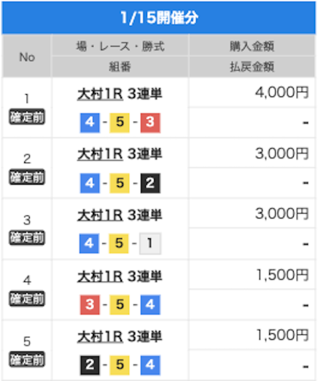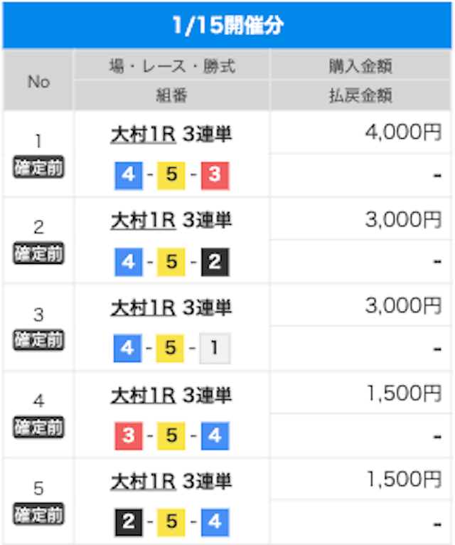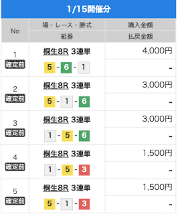 無料予想を含めて、ここまでの参加結果から見解予想は必要ないと思うので、買い目と購入金額からご覧いただこう。