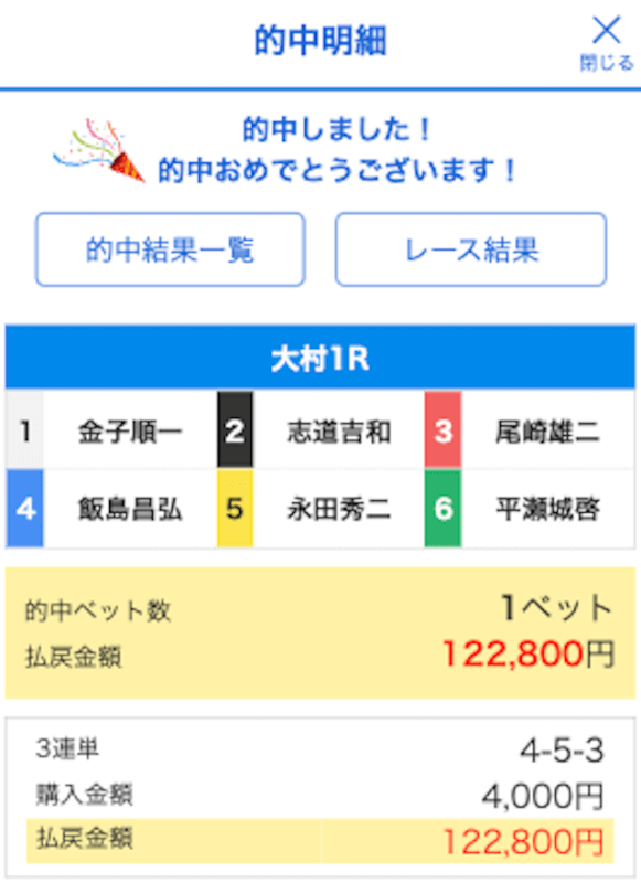 私の予想は大外れとなり、競艇トライアングルの予想が見事に的中した。