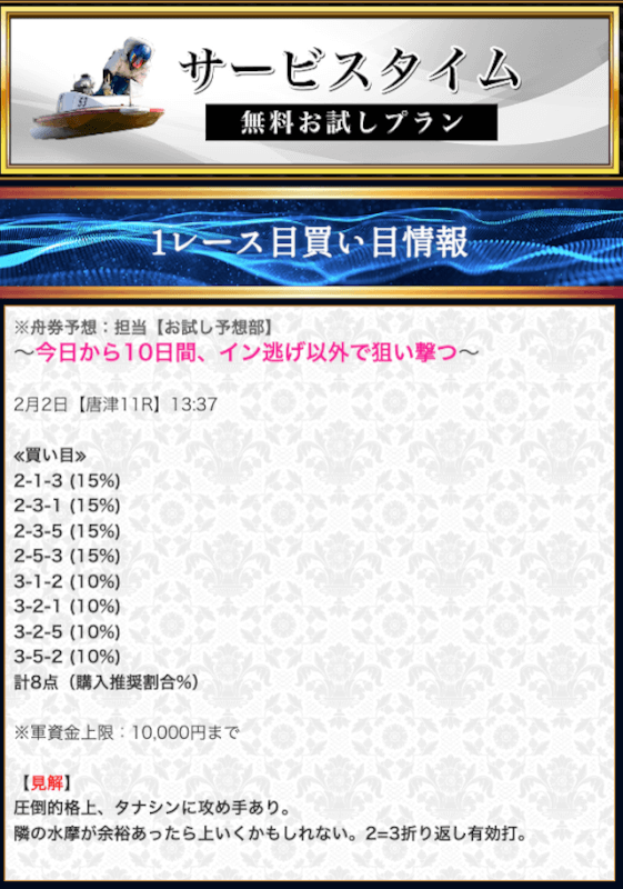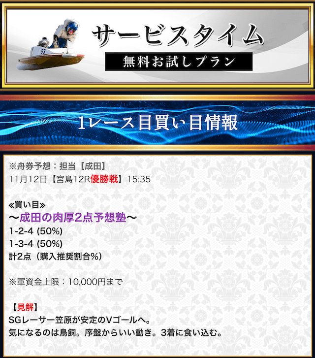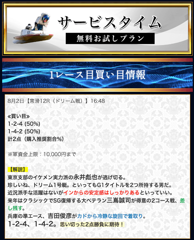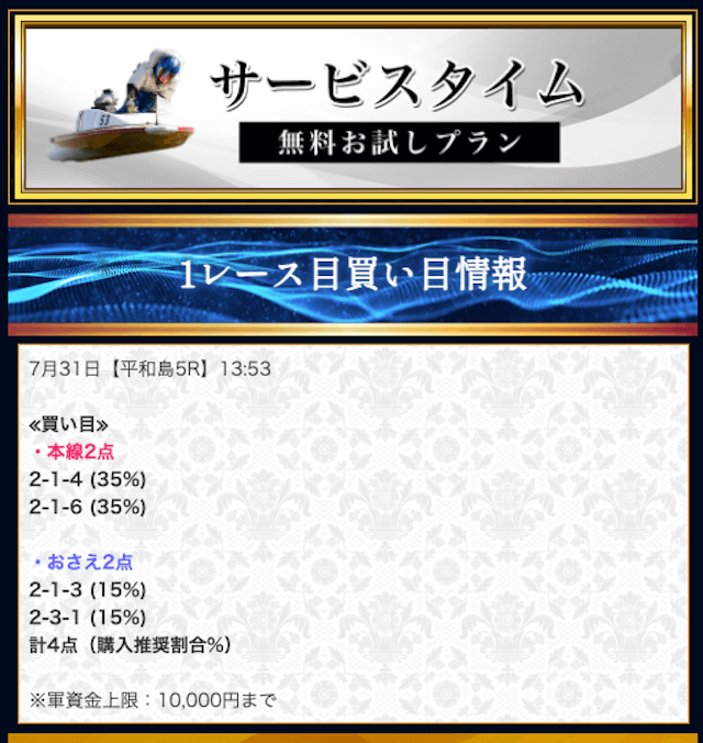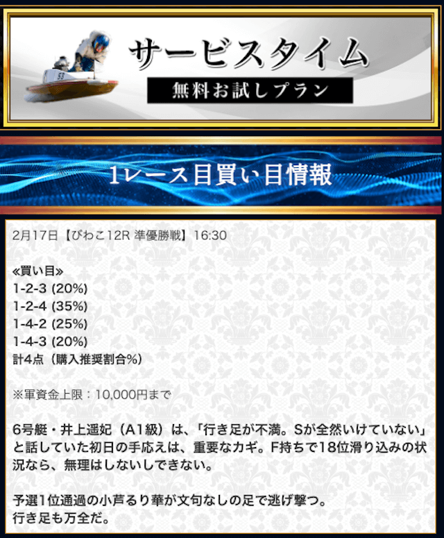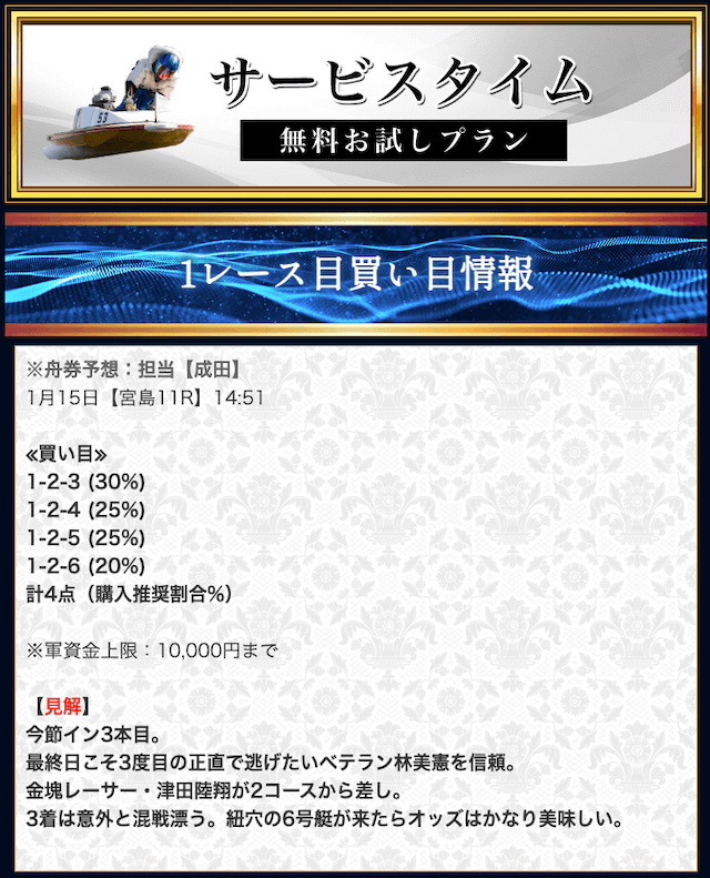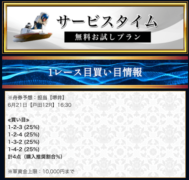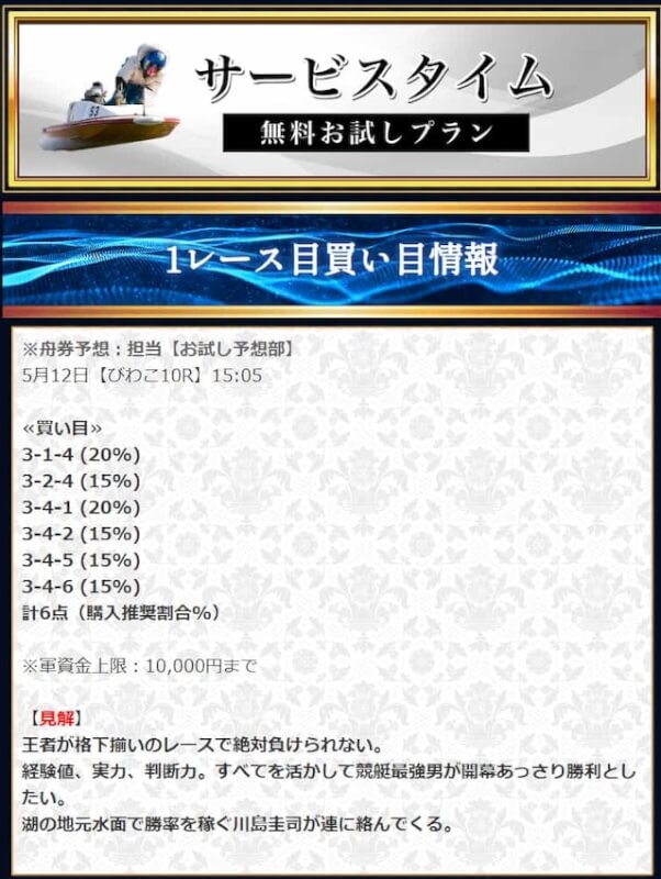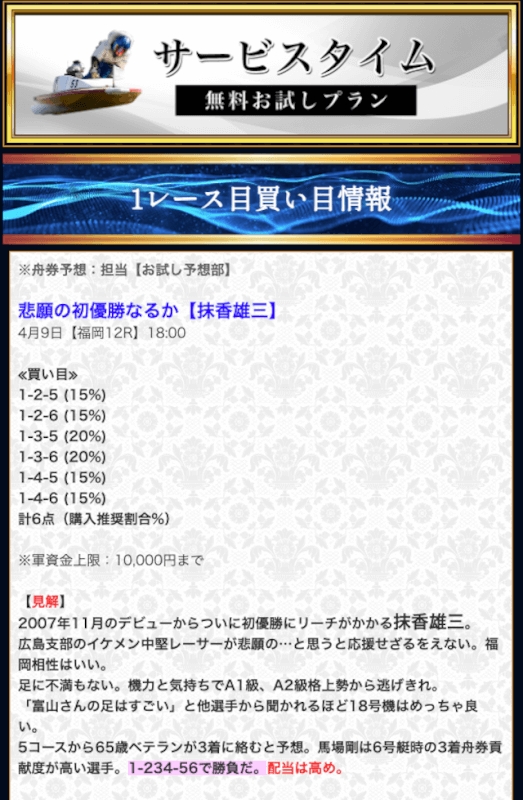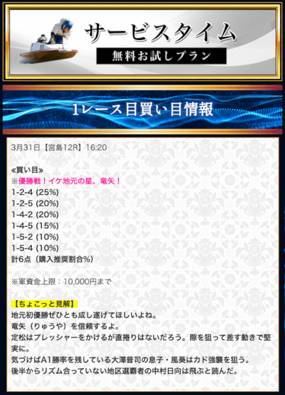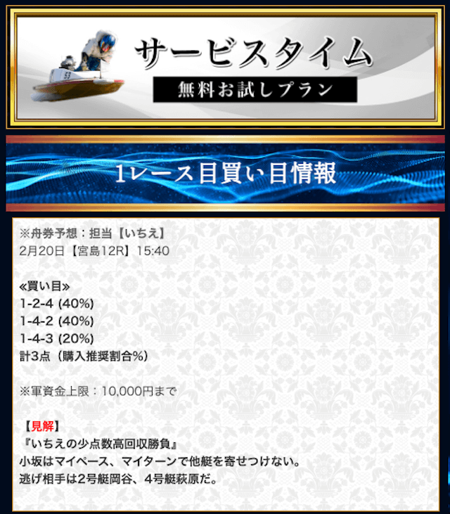 本来であれば無料予想の方へ先に参加するのですが、私は普段から競艇予想サイトで稼いでいて軍資金には余裕があるので、思い切って有料予想から敢えて実力を測ってみました。