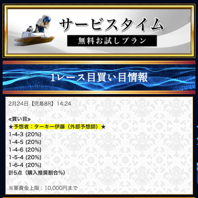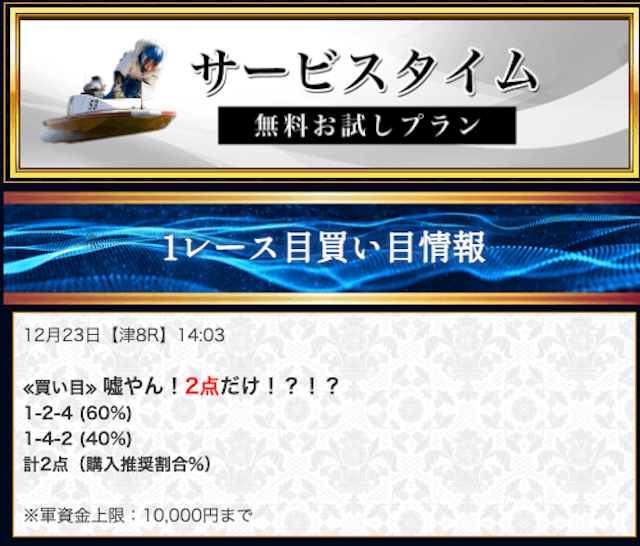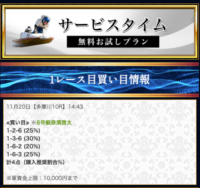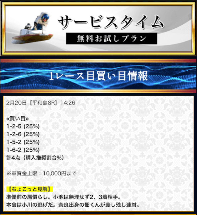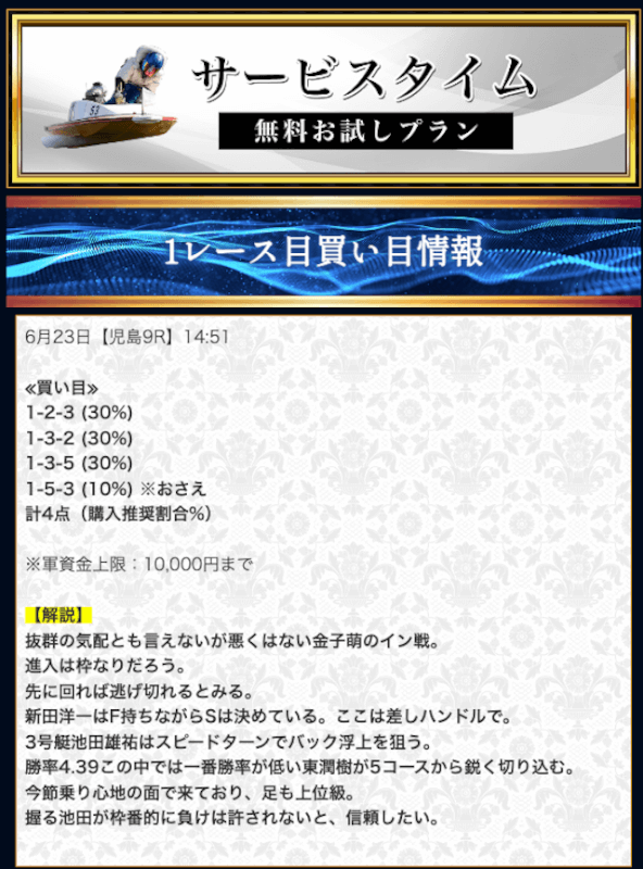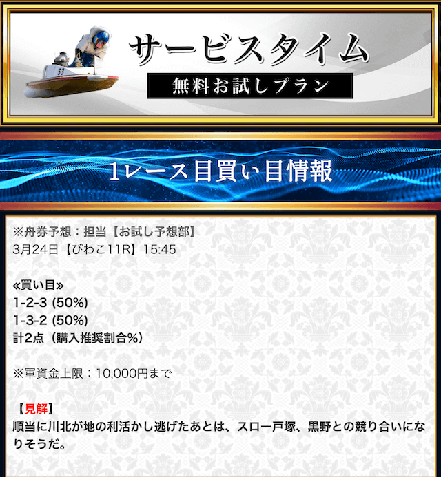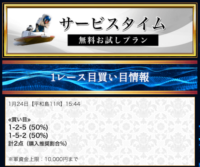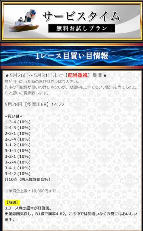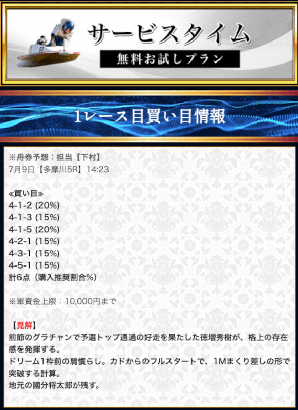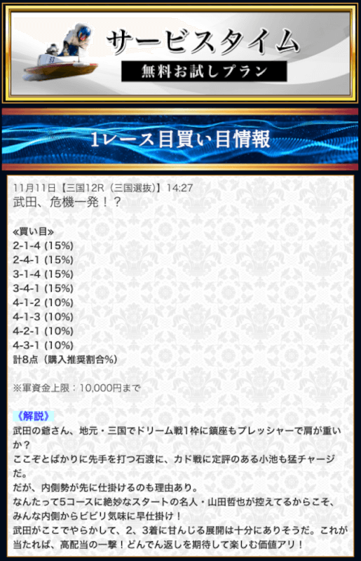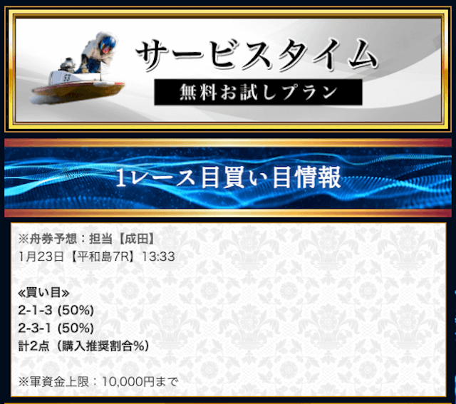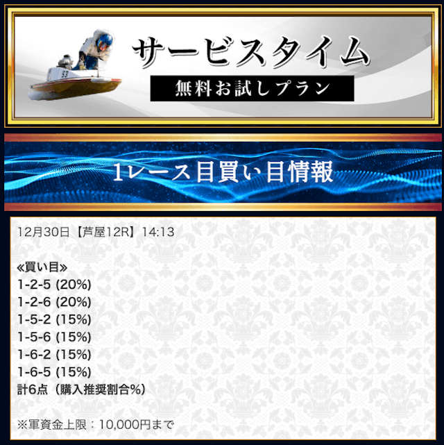 本来であれば無料予想の方へ先に参加するのですが、私は普段から競艇予想サイトで稼いでいて軍資金には余裕があるので、思い切って有料予想から敢えて実力を測ってみました。