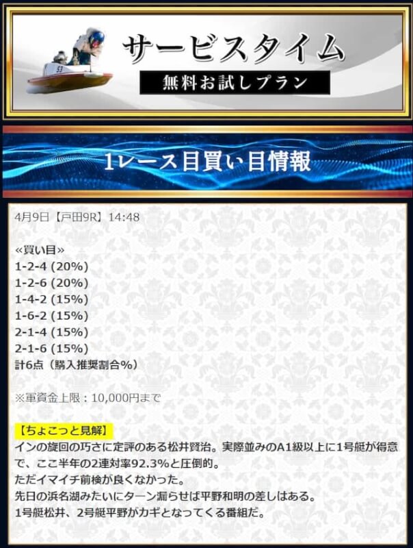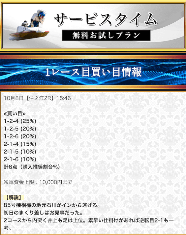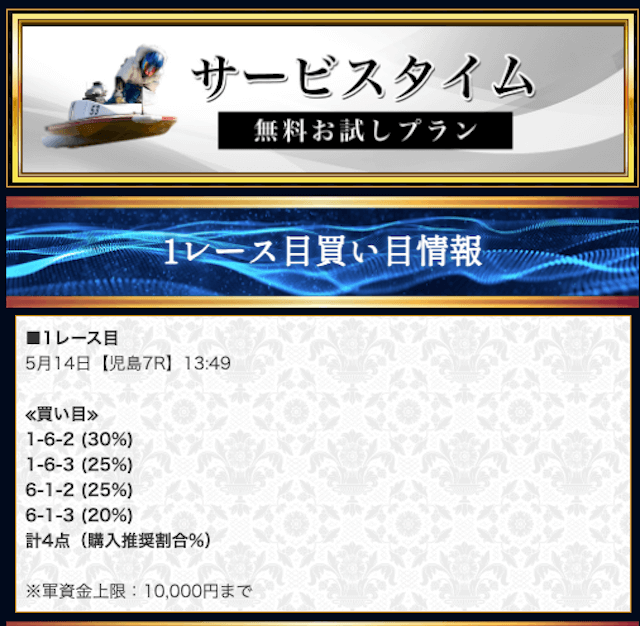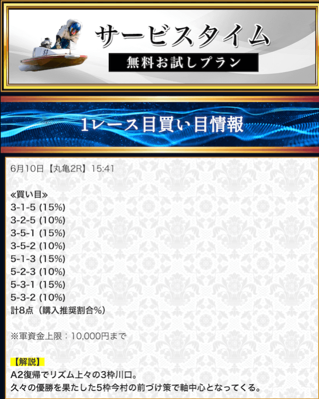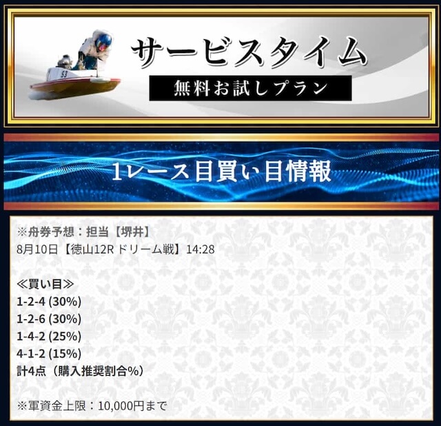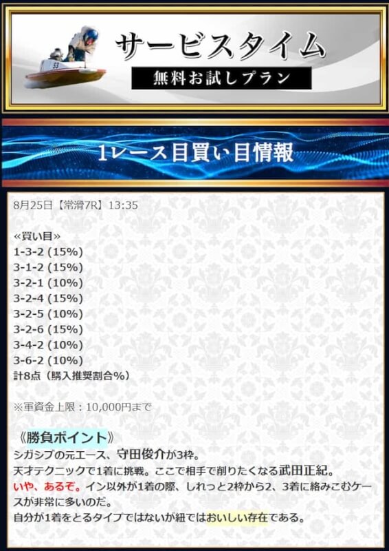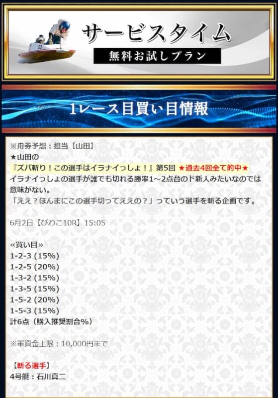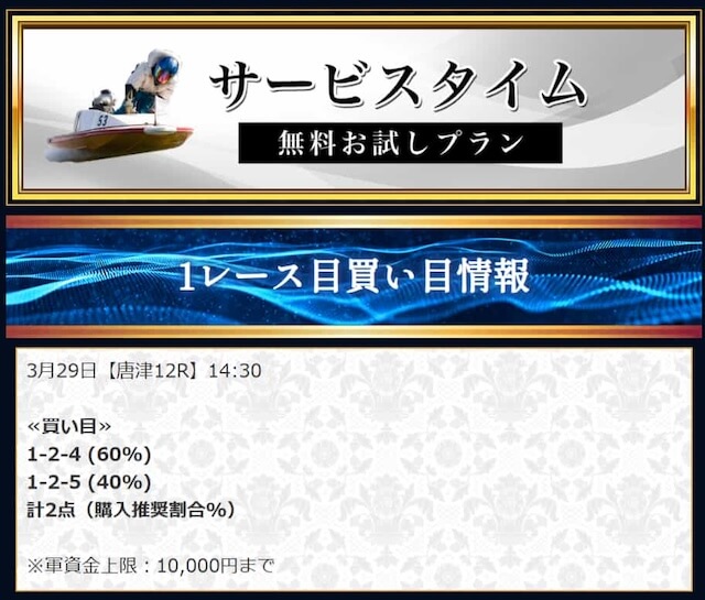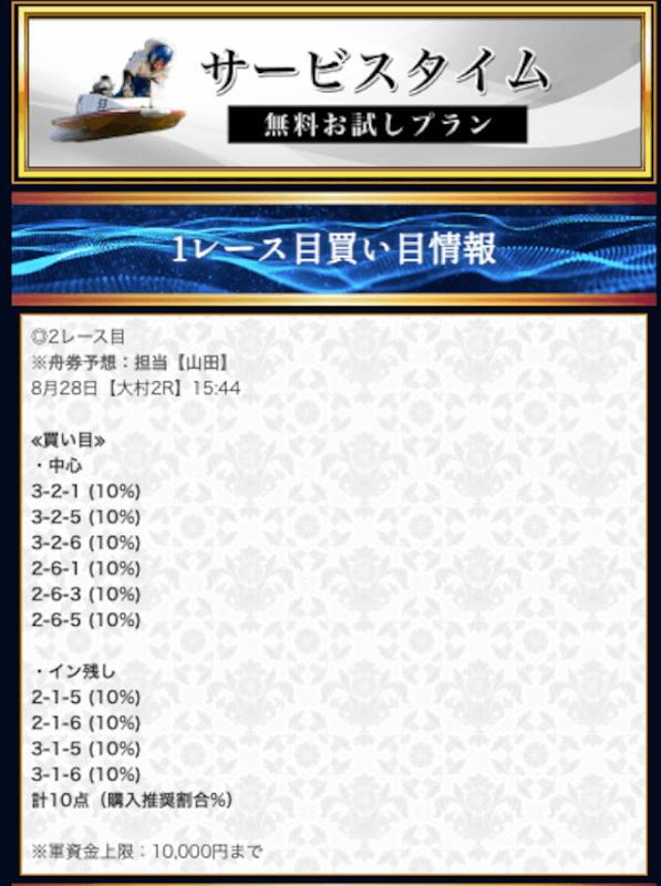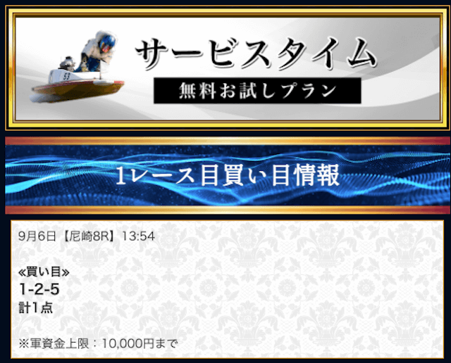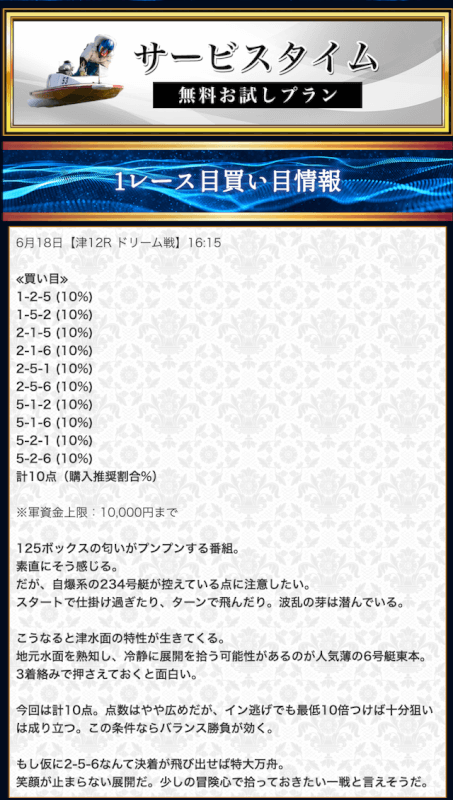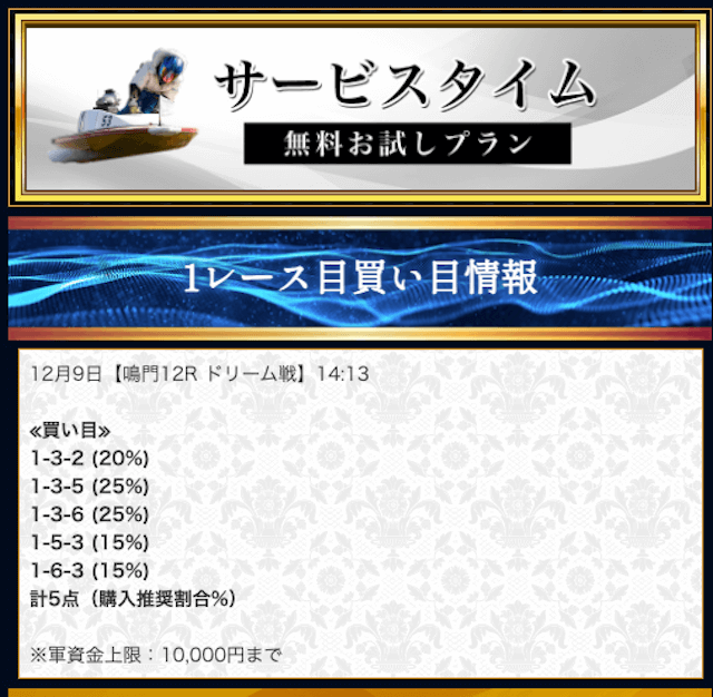 本来であれば無料予想の方へ先に参加するのですが、私は普段から競艇予想サイトで稼いでいて軍資金には余裕があるので、思い切って有料予想から敢えて実力を測ってみました。